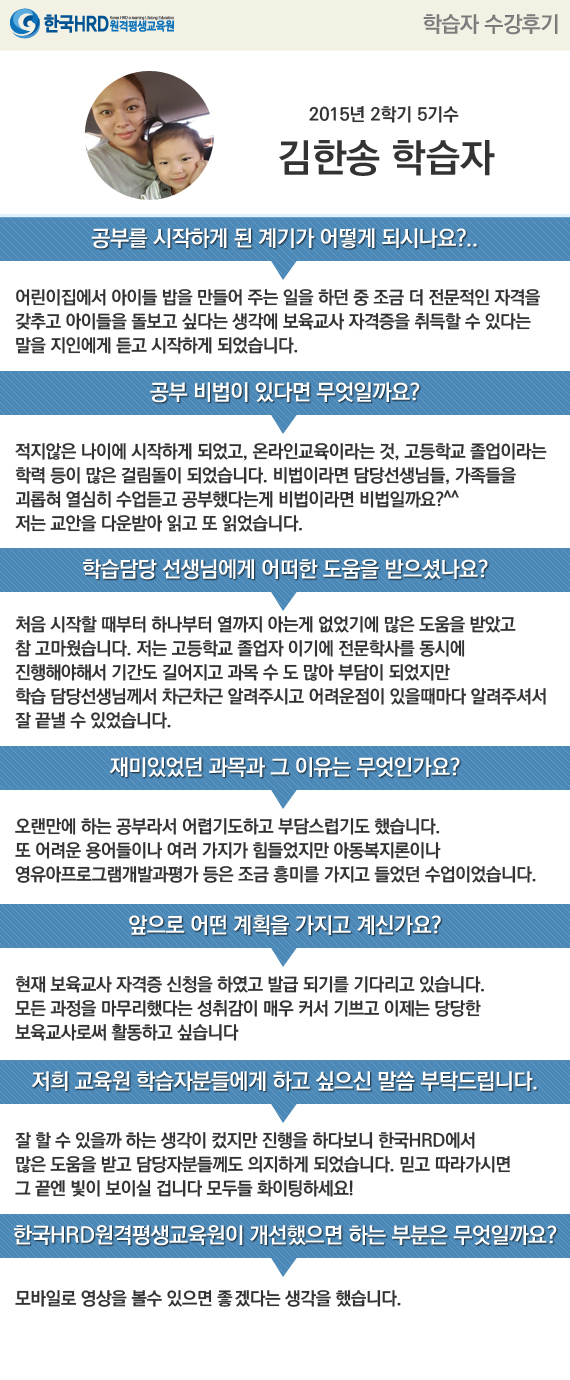 [김한송님] 어린이집에서 아이들 밥을 만들어 주는 일을 하던 중 조금 더 전문적인 자격을...